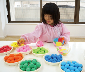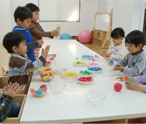幼小クラスは、絵具を混ぜて、オリジナル色粘土作りから始めました。