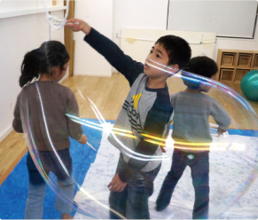 シャボン玉作りに大興奮!アトリエの床・壁はびしょびしょになりました。